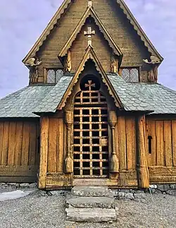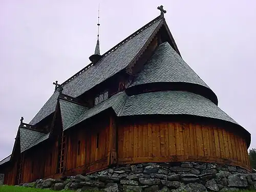 After the previous church burned down, a new wooden stave church was built on the same site. The exact age of this church is uncertain. Through radiocarbon dating, logs in the church have been dated to 1190, which somewhat contradicts previous datings of the church. Other beams in the nave date to the years 1225 and 1272. There are some claims that the church was built after 1326, but this seems to be outside the margin of error for the radiocarbon dating. Most historians say the church was built in the late 13th century. There is, however, a written account of the present church's existence in 1327, so it was certainly built by then. It is also possible that after the fire, the old church was heavily rebuilt with some materials being reused.[4][5][6]