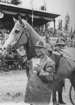 After a career of thirteen years, Reipas' last season was in 1965. By April he had won four times and his season's best time was 1:33.4. Aapeli Miettinen kept Reipas after his active career ended, and turned down many offers to buy him. One of the best known offers, five trotters and a horse transport car, was made by Kalle Hagert, known as the "Gypsy King" to his contemporaries.[8] Even after having retired, Reipas remained brisk, true to his name, and at the age of 20 years still brought home winnings from a race. Turned out on pasture, he once heard a neighbour playing the accordion, and thinking a heat was about to commence, trotted in a circle on his own. Pentti Miettinen, groom to Reipas for 15 years, described him as "extremely ardent, sensitive, and gentle-mouthed".[3]
