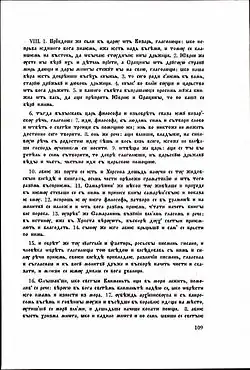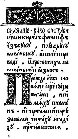 Прѣжде ѹбо словѣне не имѣхѫ писменъ · нѫ чрътами и рѣзами чьтѣхѫ и гатаахѫ погани сѫще · кръстивше же сѧ · римьсками и гръчьскыми писмены · нѫждаахѫ сѧ словѣнскы рѣчь безъ устроениа… Потомже чл҃колюбецъ б҃ъ… посла имь ст҃го Кѡнстантина философа · нарицаемаго Кирила · мѫжа праведна и истинна · и сътвори имъ · л҃ писмена и осмь · ѡва убѡ по чинѹ Гръчьскъıхь писменъ · ѡва же по словѣнъстѣи рѣчи