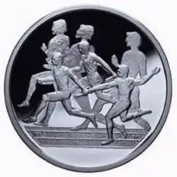 Relay race events have been selected as a main motif in numerous collectors' coins. One of the recent samples is the €10 Greek Relays commemorative coin, minted in 2003 to commemorate the 2004 Summer Olympics. In the obverse of the coin three modern athletes run, holding their batons while in the background three ancient athletes are shown running a race known as the dolichos (a semi-endurance race of approximately 3,800 metres' distance).