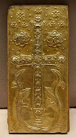 The Revolution meant a ban on conserving relics and all other sacred symbols linked to the kings, though this allowed for pieces judged to be of high artistic quality to be saved. These relics were handed over to the archbishop of Paris in 1804 and are still held in the cathedral treasury of Notre Dame, cared for by the Knights of the Holy Sepulchre and the cathedral chapter. The first Friday of every month at 3 PM, guarded by the Knights, the Holy Relics are exposed for veneration by the faithful before the cathedral's high altar.[3] Every Good Friday, this veneration lasts all day, punctuated by the liturgical offices. An exhibition entitled Le trésor de la Sainte-Chapelle was installed at the Louvre in 2001. After the April 2019 fire at Notre-Dame, the relics were moved for safekeeping first to the Paris city hall overnight,[4] and then to the Louvre.[5]