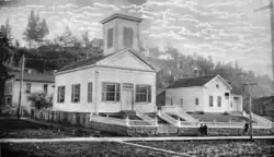In 1836, French Canadian pioneers on the French Prairie in the Willamette Valley built a log cabin chapel along the Willamette River.[4] The first Protestant church in Oregon was built in Oregon City starting in 1842.[5] Completed in 1844, this Methodist church was also the first Protestant church on the continental West Coast of what became the United States.[5] The first Roman Catholic official presence in Oregon was the apostolic vicariate for the Oregon Territory begun in 1843. By 1846, the archdiocese of Oregon was formally established. Informally considered part of the Unchurched Belt, Oregon is known for historically having a lack of religiosity compared to other U.S. states.
