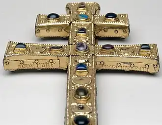The relics are still visible (but barely, they would have originally been far more discernible),[5] and include (assumed) fragments from Jesus' cross, placed behind rock crystal in the rectangular plaque located on the main shaft, prominently set between the two upper cross arms. The plaque contains a smaller cross with a single cross beam.[6]