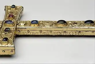 The inscriptions are intended to identify other relics as associated with the massacre of the Innocents, the tomb of Jesus, and the tomb of the Virgin Mary.[4] They include the words "De sepulcro dñi; De sepulcro be Marie" on the right side of the shaft (running up), and the words "S hermetis mi: capilli sci stephi.m" opposite on the left, running down.[2] Unusually, four sets of engravings are set along the upper and lower sides of the lower cross.[5]