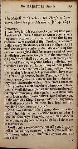 I am sorry for this occasion of coming unto you: yesterday I sent a Serjeant at Armes upon a very important occasion, to apprehend some that by my command were accused of High Treason, whereunto I did expect Obedience, and not a Message. And I must declare unto you here, that albeit no King that ever was in England shall be more careful of your Priviledges, to maintain them to the uttermost of his power then I shall be; yet you must know, that in cases of Treason, no person hath a priviledge, and therefore I am come to know if any of those persons that were accused are here; for I must tell you, Gentlemen, that so long as these persons that I have accused (for no slight crime, but for Treason) are here, I cannot expect that this House can be in the right way that I do heartily wish it: Therefore I am come to tell you, that I must have them wheresoever I finde them. Well, sithence I see all the Birds are flown, I do expect you, that you shall send them unto me, as soon as they return hither: But I assure you, in the word of the King, I never did intend any force, but shall proceed against them in a legal and fair way, for I never meant any other.