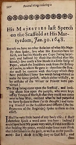 One of the last items (item 9) is the King's final speech on the scaffold "at his martyrdom", Jan 30 1648.