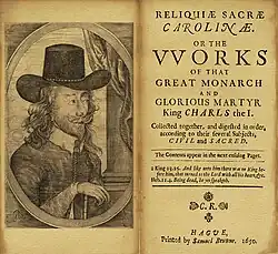 The first edition of the Reliquiae appeared in 1650 and brought all this additional material, and more, together in one publication. Three further editions were produced by 1658. Later editions of the King's Works were produced but which no longer included the words "Reliquiæ Sacræ Carolinæ" in the title.[1]