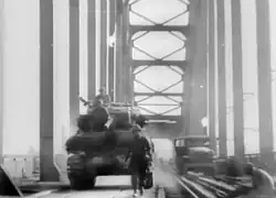 The railroad tracks on the bridge were covered with wood planks, allowing vehicles to pass.[35] Once on the bridge, the American infantry came under fire from German snipers on a partially submerged boat on the east bank and MG 42 machine gun fire from the eastern towers of the bridge, as well as from houses in Erpel. A 14th Battalion Sherman tank destroyed the boat.[41]: 11 All the tanks joined in shelling the opposite side of the river and the infantry covered the bridge and eastern side with machine gun fire, enabling ground troops to get on the bridge. The tanks successfully provided fire support to the infantry and suppressed fire from the German positions.[41]: 11 [50]