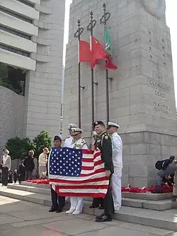Remembrance Day (Chinese: 和平紀念日; Cantonese Yale: wòh pìhng géi nihm yaht; lit. 'Peace remembering day') is an anniversary in Hong Kong initially celebrating the end of World War I,[1] and was later expanded to commemorate the lives lost in the Battle of Hong Kong and World War II.[2] The anniversary was initially celebrated annually on November 10, and is now celebrated on the second Sunday of November. On Remembrance Day, memorial ceremonies take place at the Cenotaph in Central.