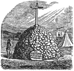 In May 1859, Major James H. Carleton, of the U.S. Army, and Cavalry arrived at Mountain Meadows with orders to bury the bones of the massacre's victims. After searching the area, the remains of 34 victims were buried on the northern side of a ditch. (This ditch was a defensive trench dug by the emigrants to protect themselves from their attackers.) Around and above this grave a rude monument was built of loose granite stones, creating a cairn. It was conical in form, fifty feet in circumference at the base, twelve feet in height and supported a cross hewn from red cedar wood. From the ground to the top of the cross was twenty-four feet. On the transverse part of the cross, facing towards the north, was an inscription carved in the wood from Romans 12:19:[1]