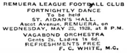 They held their annual general meeting on 7 March at 7.30 at St. Aidan's Hall in Remuera. Mr. G. McConnell was their honorary secretary.[29] On 28 April they held a practice for all grades at the Remuera ground.[30] The 1928 season saw Remuera field sides in the second grade, third grade intermediate which was a weighted grade limited to 10st 7lb (66.7kg), and the fourth grade.[31] They published advertisements in the newspaper to attract more players into the 3rd grade intermediate side.
