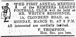 In March 1927 advertisements were published in the Auckland Star and New Zealand Herald for an annual meeting for the "First Annual Meeting of the Remuera League Football Club" at Mr. White’s residence at 1A Clonbern Road for 21 March at 8pm. The honorary secretary publishing the advertisement was Frank Thompson who was a well known senior referee through the 1910s to the 1930s.[15] A short article was published in the New Zealand Herald on 24 March which said "In 1914 two strong junior teams represented the Remuera League Club. It is intended to revive the club's activities and already several meetings have been held. During the present week a general meeting was called, and 36 enthusiasts attended. It is intended to nominate two junior teams, and the present membership is over 30. The revival of the club has been in the hands of Frank Thompson, the well known referee, and Mr. F. White and L. Dickenson, two league enthusiast. Mr. W.J. Hammill, chairman of the Management Committee of the Auckland League, addressed the gathering, and answered many questions concerning the future policy of the code." At the conclusion of the meeting the following officers were elected:- President, Dr. Pezaro; honorary secretary, Mr. G. McConnell; honorary treasurer, Mr. A. Grey; and chairman, Mr. L. Dickenson.[16]
