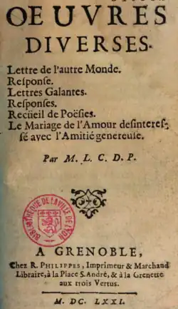 René Le Pays, sieur de Plessis-Villeneuve (Nantes or Fougères, 1636 - Paris, April 30, 1690[3]), sometimes credited as M.L.C.D.P., was a French poet and tax farmer-general (fermier général des gabelles) in Dauphiné and Provence.