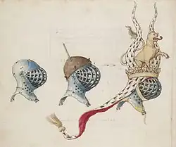 King René's Tournament Book (Le Livre des tournois or Traicte de la Forme de Devis d'un Tournoi; c. 1460) describes rules of a tournament. The most famous and earliest of the many manuscript copies[25] is kept in the French National Library. This is—unusually for a deluxe manuscript—on paper and painted in watercolor. It may represent drawings by Barthélemy d'Eyck, intended as preparatory only, which were later illuminated by him or another artist. There are twenty-six full and double page miniatures. The description given in the book is different from that of the pas d'armes held at Razilly and Saumur; conspicuously absent are the allegorical and chivalresque ornamentations that were in vogue at the time. René instead emphasizes he is reporting on ancient tournament customs of France, Germany and the Low Countries, combining them in a new suggestion on how to hold a tournament. The tournament described is a melee fought by two sides. Individual jousts are only briefly mentioned.