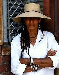Her garden was profiled by ABC News for its water conservation ability during an extended drought for the region.[3] Gunter designed and restored several local neighborhood gardens and parks,[4][5][6] and began a landscape firm called Urbanscapes.[7] On one assignment, she asked what the client wanted from a front yard, and to meet the needs of water conservation, beauty, and privacy, Gunter recycled a fence, mounded organic earth strategically to elevate selected areas, and planted large drought-resistant plants to make the house almost invisible from many perspectives to form a "kind of private park".[8] She encourages neighbors to conserve water while organizing large block parties to build community ties.[9] Gunter uses plant groups acclimatized for low water consumption;[10] drought-resistant plants at her own garden include Agave weberi (syn. A. neglecta) and Acacia baileyana along with other grasses and ground covers, and features a dry 'riverbed' in the middle for walking.[11] Her yard has been described as the only "certified wildlife habitat" in southern Los Angeles.[12] Her conservation efforts have been lauded publicly by water officials.[12] In 2013 she also launched a mobile organic produce service called "DO! Daily Organics", delivering fruits and vegetables to residents of South Los Angeles,[13][14][15] with a storefront built from a discarded shipping container.[16]