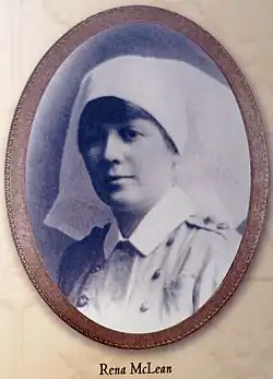 Rena Maude McLean (June 14, 1879 – June 27, 1918) was a Canadian nurse who volunteered during World War I. She helped set up the first hospital in France staffed exclusively by Canadians, and also served in the UK and Greece.[1] She died when the Canadian hospital ship HMHS Llandovery Castle was torpedoed off the coast of Ireland.