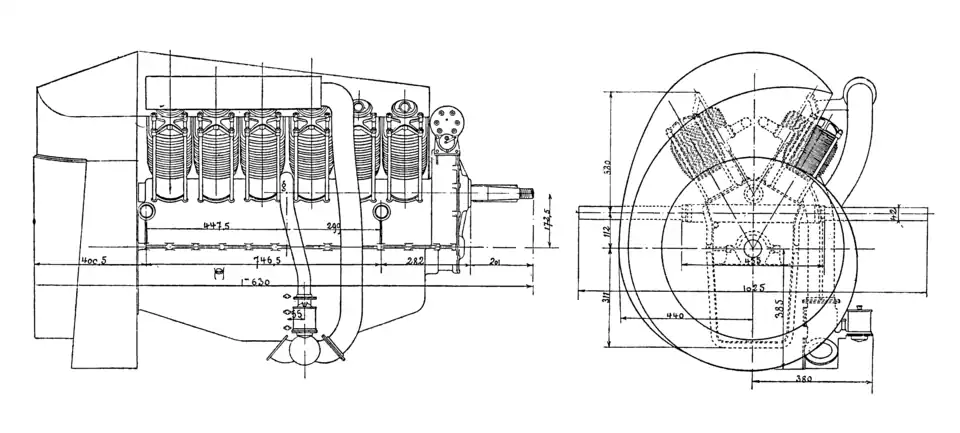 The V-12 engine had its two rows of cylinders angled at 60 degree to each other and had a cylinder bore of 96 mm and a stroke of 140 mm. The cylinders and cylinder heads were separate cast-iron pieces with cast fins for air-cooling. The cylinder head was tightened to the cylinder with a copper-asbestos washer, and then secured by a cross-shaped clamp which was bolted to the crankcase with four long studs.[2] Airflow for cooling the cylinders was generated with a fan driven from the rear end of the crankshaft. The fan was blowing air into the sheet metal enclosed chamber between the two rows of cylinders, which then left the enclosure through the narrow spaces between the cylinders, passing through the cylinder's cooling-fins.