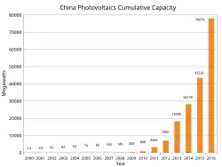 China is also a major leader of clean energy technology.[6] As Chinese renewable manufacturing has grown, the costs of renewable energy technologies have dropped dramatically due to both innovation and economies of scale from market expansion.[5] In 2015, China became the world's largest producer of photovoltaic power, with 43 GW of total installed capacity.[7][8] From 2005 to 2014, production of solar cells in China has expanded 100-fold.[5]