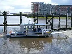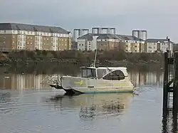 The crossing, between the area of Yoker in Glasgow and the town of Renfrew in Renfrewshire, is only 200 metres, with graded slipways on each side. The service operated between 6.30 am and 9.30 pm, being on-demand at peak times and half-hourly at other times. The company planned to extend the service to Braehead.[15] The service had reliability issues, with two weeks out of service in 2017 and three weeks in 2018 as of late June. The service was due to continue operating despite the new bridge opening between Renfrew and Yoker.[16] However on May 31st it was confirmed that the ferry would cease operation effective immediately.[17][18]
