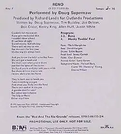 "Reno" is a song co-written and recorded by American country music artist Doug Supernaw. It was released in May 1993 as the second single from his album Red and Rio Grande. It peaked at number 4 in the United States,[1] and number 12 in Canada. It was his first top ten hit.