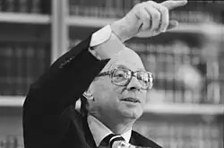 Knapen, who had distanced himself from the Society soon after its foundation, accused De Telegraaf and de Volkskrant of taking the Society way too seriously, and called the media controversy a "farce".[14] Van Amerongen, however, stood up defiantly in De Groene Amsterdammer, in which he indeed explained "Decision 4" to be a mere joke, but the republican initiative as a whole "extremely serious" and "serious in every sense", and provided more legitimacy for the cause. He primarily rebuked De Telegraaf, accusing it of hypocrisy by first calling the emergence of the Republican Society "barely noteworthy", before filling page after page about it for an entire week, and write down reviling remarks from several famous Dutch people addressed to the republicans (singer Gerard Joling called them "traitors").[9][15] Some like historian Anton van Hooff joined the ranks of the Society,[16] other republicans such as Socialist Party leader Jan Marijnissen did not (no 'conspiratory clubs'), but did support having a public nationwide debate on the monarchy, which in their opinion unjustly appeared to be a taboo subject.[17] Several politicians and commentators proceeded to sweeten the issue, which, despite the serious undertone, appeared to be a partially "derailed joke", because the prankish remarks in Vinken's minutes such as "Decision 4" were unintentionally taken seriously in print.[18] Although the existence of the Republican Society was revealed prematurely and rather clumsily, it succeeded in having the form of government debated nationally.[19] One year later, the media no longer wrote about the royal house without criticism, and the membership of the Republican Society grew rapidly.[20]
