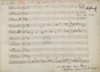 Michael Haydn wrote the Missa pro defuncto Archiepiscopo Sigismondo, or more generally Missa pro Defunctis, Klafsky I:8, MH 155, following the death of the Count Archbishop Sigismund von Schrattenbach in Salzburg in December 1771. Haydn completed the Requiem before the year was over, signing it "S[oli] D[eo] H[onor] et G[loria.] Salisburgi 31 Dicembre 1771." At the beginning of that year, his daughter Aloisia Josefa[1] died. Historians believe "his own personal bereavement" motivated the composition.[2] Contemporary materials which have survived to the present day include the autograph score found in Berlin, a set of copied parts with many corrections in Haydn's hand in Salzburg and another set at the Esterházy castle in Eisenstadt, and a score prepared by the Salzburg copyist Nikolaus Lang found in Munich.[3]