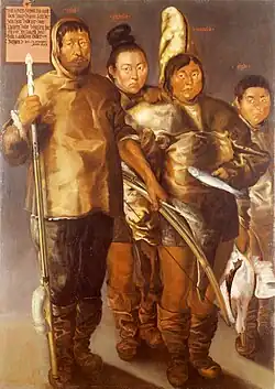 Inuit skin clothing has long been of interest to artists and academics of all kinds.[1] Europeans interested in the Inuit and their culture began to create artistic depictions of Inuit clothing as early as the 16th century.[2] These images were typically sourced from the clothing worn by Inuit who travelled to Europe (whether voluntarily or as captives), clothing brought to museums by explorers, and from written accounts of travels to the Arctic. The earliest of these was a series of illustrated broadsides printed after an Inuk mother and child from Labrador were brought to the European Low Countries in 1566. In 1577, the privateer Martin Frobisher brought three Inuit – Kalicho, Arnaq and Nutaaq – to England as captives, and the painter John White produced detailed watercolor portraits of them.[3] A 1654 painting by Salomon von Hauen, commissioned at Bergen, Norway, is the oldest known portrait depicting the traditional clothing of the Kalaallit people of Greenland. It depicts a group of four Kalaallit who were kidnapped by a Danish trade ship, each wearing traditional skin clothing.[4] Numerous other paintings and engravings of Inuit and their clothing were created in Europe over the following centuries. [5][6]