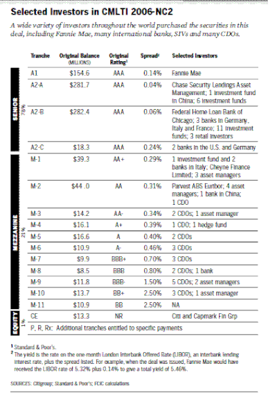 The first private label deals in the late 1980s and early 1990 often had only two tranches, but by 2005–06 the deals became more complex.[26] One "typical" mortgage-backed "deal" from one of the peak years of private label subprime mortgage securities (2006) was described in the Financial Crisis Inquiry Report.[26] (See table to the right.) Dubbed "CMLTI 2006-NC2", the deal involved 4499 subprime mortgages originated by New Century Financial—a California-based lender—and issued by a special purpose entity created and sponsored by Citigroup. The entity issued 19 tranches of mortgage-backed bonds worth $947 million. Since Citigroup and other firms focused on achieving high ratings, the (four) senior ranches rated triple A made up 78% or $737 million of the deal. Eleven tranches were "mezzanine" – three rated AA, three A, three BBB and two BB (junk). The most junior tranche was known as "equity" or "residual" or "first loss". It had no credit rating and was split between Citigroup and a hedge fund.[26] The more "junior" the tranche, the higher its risk and the higher its interest rate in compensation.[27]