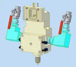 The components meet in a mixing chamber, usually made of stainless steel and there they are mixed homogeneously by a rotating blender. To optimize mixing, the rotational speed can be controlled electronically. Mixing chamber and blender have to be cleaned with a special cleaning fluid to be used again. Usually this happens automatically.