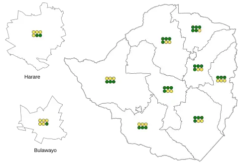 | Matabeleland North | 13 | 98,579 | 44.8% | 4 | 102,502 | 46.6% | 9 | 8,408 | 3.8% | 10,634 | 4.8% | 220,123 |