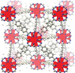 MOF-177 is a metal-organic framework (MOF) composed of zinc (Zn) nodes and terephthalate linkers. It is distinguished by its exceptionally large pore volume and high surface area, making it one of the most porous MOFs synthesized. These properties make MOF-177 highly effective for gas storage and separation, particularly for applications involving hydrogen and carbon dioxide capture. Its extensive porosity has contributed to its recognition as a benchmark material in the field of porous frameworks.[52]
