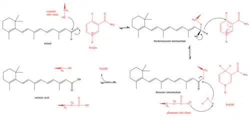 The proposed mechanism of retinal dehydrogenase begins with a key cysteine residue in the active site attacking the aldehyde group in retinal to form a thiohemiacetal intermediate.[3] Then, a hydride shift is facilitated by the enzyme to form NADH and a thioester intermediate. This hydride shift has been shown to be stereospecific in a subset (class 3) of retinal dehydrogenases.[8] The thioester intermediate is then attacked by a water molecule, which is made more nucleophilic by a glutamate residue that lies near the active site.[9] There has been some debate as to whether the glutamate residue near the active site acts as a general base during the reaction or whether it is more limited and merely deprotonates the catalytic cysteine to make the cysteine more nucleophilic.[9] Kinetic studies have supported this mechanism by showing that the reaction follows an ordered sequential path with NAD+ binding first which is followed by the binding of retinal, the catalytic breakdown of retinal to retinoic acid, the release of retinoic acid, and finally the release of NADH.[10]