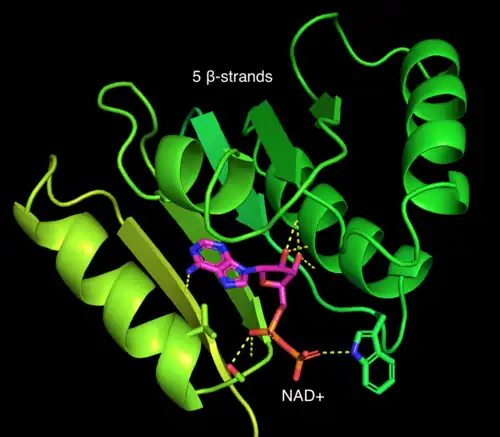 - ^ a b Liu ZJ, Sun YJ, Rose J, Chung YJ, Hsiao CD, Chang WR, Kuo I, Perozich J, Lindahl R, Hempel J, Wang BC (April 1997). "The first structure of an aldehyde dehydrogenase reveals novel interactions between NAD and the Rossmann fold". Nature Structural Biology. 4 (4): 317–26. doi:10.1038/nsb0497-317. PMID 9095201. S2CID 21436007.
