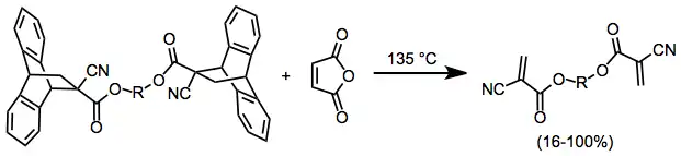 If isolation or reaction of an elusive diene or dienophile is the goal, one of two strategies may be used. Flash vacuum pyrolysis of Diels–Alder adducts synthesized by independent means can provide extremely reactive, short-lived dienophiles (which can then be captured by a unique diene).[11] Alternatively, the rDA reaction may be carried out in the presence of a scavenger. The scavenger reacts with either the diene or (more typically) the dienophile to drive the equilibrium of the retro-DA process toward products. Highly reactive cyanoacrylates may be isolated from Diels–Alder adducts (synthesized independently) with the use of a scavenger.[12]