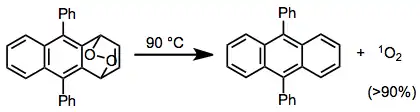 The concerted release of oxygen via rDA results in the formation of singlet oxygen. Very high yields of singlet oxygen result from rDA reactions of some cyclic peroxides—in this example, a greater than 90% yield of singlet oxygen was obtained.[16]