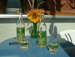 Retsina (Greek: ρετσίνα) is a Greek white (or rosé or very rarely red) resinated wine, which has been made for at least 2,000 years.[1][2] Its unique flavor is said to have originated from the practice of sealing wine vessels, particularly amphorae, with Aleppo pine resin in ancient times.[3][4][5] Before the invention of impermeable glass bottles, oxygen caused many wines to spoil within the year. Pine resin helped keep air out, while infusing the wine with resin aroma. The Romans began to use barrels in the 3rd century AD, removing any oenological necessity for resin, but the flavor itself was so popular that the style is still widespread today.[6][7][8][9]