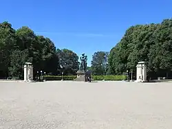 The monument is flanked by two square gate pillars, each topped by a seashell in bronze with the concave side facing upwards. Each pillar has its front decorated with a Doric pilaster. The gate pillars measure approximately 475 by 365 by 180 centimetres (15.6 by 12.0 by 5.9 ft). Their rear sides connect to two low, ramp-like walls in French travertine that flank the entrance to the park.