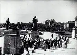 Sønderjylland was reunited with Denmark on 15 June 1920. The City of Copenhagen launched a preliminary competition for the design of a reunification monument in 1925. The competition opened for a number of possible locations. A total of 112 entries were submitted, of which 10 received awards. The final monument was a donation from the Carlsberg Foundation. Axel Poulsen was charged with the design in 1926. The bronze sculpture was cast in Lauritz Rasmussen's bronze foundry in Nørrebro. The monument was unveiled on 1 June 1930.[1] Mayor Peder Jørgen Pedersen and chairman of the Carlsberg Foundation Anders Bjørn (Asbjørn) Drachmann spoke at the ceremony.[2]