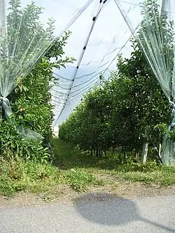 At one time, grapes were the main crop grown in the area, particularly the variety "Groppello," which dates back to the 17th century and from which a local wine was made. Nowadays, the economy of the region is very dependent on the production of apples, in particular the variety Golden Delicious.[4] A large proportion of the orchards are protected from bird damage to the crop by netting which is tied back during much of the year. Over 5,000 farmers in the area are members of the Melinda cooperative, a consortium of apple growers in the Val di Non and Val di Sole, which undertakes quality control and markets the apples on their behalf under the trade name "Melinda".[6]