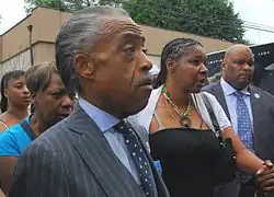 After the July 2014 death of Eric Garner on Staten Island, New York, by a New York City Police Department officer, Daniel Pantaleo, Sharpton organized a peaceful protest in Staten Island on the afternoon of July 19, and condemned the police's use of the chokehold on Garner, saying that "there is no justification" for it.[71] Sharpton had also planned to lead a protest on August 23, in which participants would have driven over the Verrazzano-Narrows Bridge, then traveled to the site of the altercation and the office of District Attorney Dan Donovan[72] This idea was scrapped in favor of Sharpton leading a peaceful march along Bay Street in Staten Island, where Garner died; over 5,000 people marched in the demonstration.[73][74][75][76]