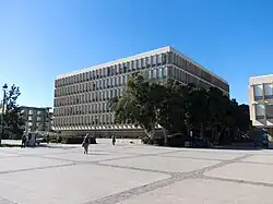 Revelle Plaza is the centerpiece of Revelle College, and has served as an important space for campus activities and socialization since its creation. During the mid-to-late sixties, Revelle Plaza was the location of many protests. The May 1970 Peace Memorial in its southeast corner commemorates the anti-war self-immolation of Revelle student George Winne Jr.[17] The adjacent fountain was donated by Pacific Southwest Airlines in 1965.[18]