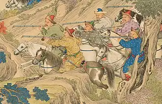 ![]() Khoja rebels and Qing soldiers fighting at the Battle of Yesil-kol-nor near Yashilkul Lake, 1759. Painted by Jean-Damascène Sallusti in 1764. | |||||||