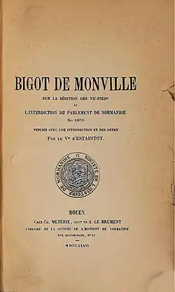 - (in French) Mémoires du président Bigot de Monville sur la sédition des nu-pieds et l’interdiction du parlement de Normandie en 1639, Rouen, Métérie, 1876