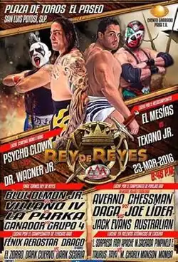 Starting in 1997 and every year since then the Mexican Lucha Libre, or professional wrestling, companyAAA has held a Rey de Reyes (Spanish for "King of Kings') show in the spring. The 1997 version was held in February,[1] while all subsequent Rey de Reyes shows were held in March. As part of their annual Rey de Reyes event AAA holds the eponymious Rey de Reyes tournament to determine that specific year's Rey.[2] Most years the show hosts both the qualifying round and the final match, but on occasion the qualifying matches have been held prior to the event as part of AAA's weekly television shows.[3] The traditional format consists of four preliminary rounds, each a Four-man elimination match with each of the four winners face off in the tournament finals, again under elimination rules.[1] There have been years where AAA has employed a different format to determine a winner.[3] The winner of the Rey de Reyes tournament is given a large ornamental sword to symbolize their victory, but is normally not guaranteed any other rewards for winning the tournament, although some years becoming the Rey de Reyes has earned the winner a match for the AAA Mega Championship. From 1999 through 2009 AAA also held an annual Reina de Reinas ("Queen of Queens") tournament, but later turned that into an actual championship that could be defended at any point during the year, abandoning the annual tournament concept.[4][5][6] The 2016 show will be the 20th Rey de Reyes show in the series.