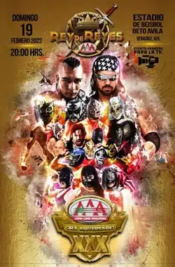 Since 1997 and every year except 2020, the Mexican Lucha Libre, or professional wrestling, company AAA has held a Rey de Reyes (Spanish for "King of Kings") show in the spring. The 1997 version was held in February,[1] while all subsequent Rey de Reyes shows were held in March. As part of their annual Rey de Reyes event AAA holds the eponymous Rey de Reyes tournament to determine that specific year's Rey.[2] Most years the show hosts both the qualifying round and the final match, but on occasion the qualifying matches have been held prior to the event as part of AAA's weekly television shows.[3] The traditional format consists of four preliminary rounds, each a Four-man elimination match with each of the four winners face off in the tournament finals, again under elimination rules.[1] There have been years where AAA has employed a different format to determine a winner.[3] The winner of the Rey de Reyes tournament is given a large ornamental sword to symbolize their victory, but is normally not guaranteed any other rewards for winning the tournament, although some years becoming the Rey de Reyes has earned the winner a match for the AAA Mega Championship. From 1999 through 2009 AAA also held an annual Reina de Reinas ("Queen of Queens") tournament, but later turned that into an actual championship that could be defended at any point during the year, abandoning the annual tournament concept.[4][5][6] The 2022 show will be the 25th Rey de Reyes show in the series.