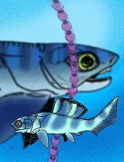| Artist's reconstruction of Rhachiosteus (with Trematosteus in the background) | |