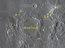 By convention, these features are identified on lunar maps by placing the letter on the side of the crater midpoint that is closest to Rhaeticus.[4]
