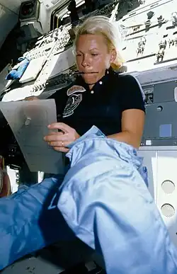 Seddon officially became an astronaut in August 1979, after NASA decided that one year of training was sufficient.[24][25] As with earlier astronaut groups, each astronaut candidate was assigned a particular specialization; Seddon's assignment was the Space Shuttle food system and the orbital medical kit.[26] For STS-1, the first orbital spaceflight of NASA's Space Shuttle program and the inaugural flight of the Space Shuttle Columbia, Abbey decided that the five MDs of the 1978 and 1980 astronaut groups – Norman Thagard, Anna Fisher and Seddon from the 1978 group, and Bill Fisher and Jim Bagian from the 1980 group – would be assigned to the search and rescue helicopters supporting the flight. These would be required if the Space Shuttle crashed or the astronauts had to eject.[27] Seddon was placed in charge of the group, and as such could choose her assignment. She, therefore, decided to join the group at Cape Canaveral. In the event, the mission went well, and search and rescue were not required.[28]