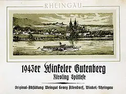 Since the Verona donation in 983, the Rheingau belonged to the archbishopric of Mainz. Legend has it that Charlemagne let the first vineyards be planted in the region, close to present-day Schloss Johannisberg.[2] However finds like a Roman origin grapevine cutting knife point to even earlier cultivation. Better documented is the early influence of the church on Rheingau winemaking, which was controlled from Eberbach Abbey. Augustinians and Benedictines are known to have inhabited the area of the later abbey from 1116, and in 1135 the Cistercians arrived, sent out from Clairvaux. Legend has it that the Cistercians, which are also credited with having founded the wine industry in Burgundy, brought Pinot noir with them to Rheingau, although the earliest record of the grape variety in Rheingau is from 1470.[3] The slopes down from the Taunus mountains belonging to Eberbach Abbey were planted as vineyards in the 12th century, and early in the 13th century the vineyards had reached their present area. In medieval times, more red than white wine was produced, usually as Gemischter Satz, i.e. the vineyards were planted with mixed varieties which were vinified together.