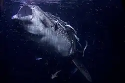 The first attempt at keeping whale sharks in captivity was in 1934 when an individual was kept for about four months in a netted-off natural bay in Izu, Japan.[94] The first attempt of keeping whale sharks in an aquarium was initiated in 1980 by the Okinawa Churaumi Aquarium (then known as Okinawa Ocean Expo Aquarium) in Japan.[91] Since 1980, several have been kept at Okinawa, mostly obtained from incidental catches in coastal nets set by fishers (none after 2009), but two were strandings. Several of these were already weak from the capture/stranding and some were released,[91] but initial captive survival rates were low.[93] After the initial difficulties in maintaining the species had been resolved, some have survived long-term in captivity.[91] The record for a whale shark in captivity is an individual that, as of 2021, has lived for more than 26 years in the Okinawa Churaumi Aquarium from Okinawa Ocean Expo Aquarium.[95][91] Following Okinawa, Osaka Aquarium started keeping whale sharks and most of the basic research on the keeping of the species was made at these two institutions.[96]